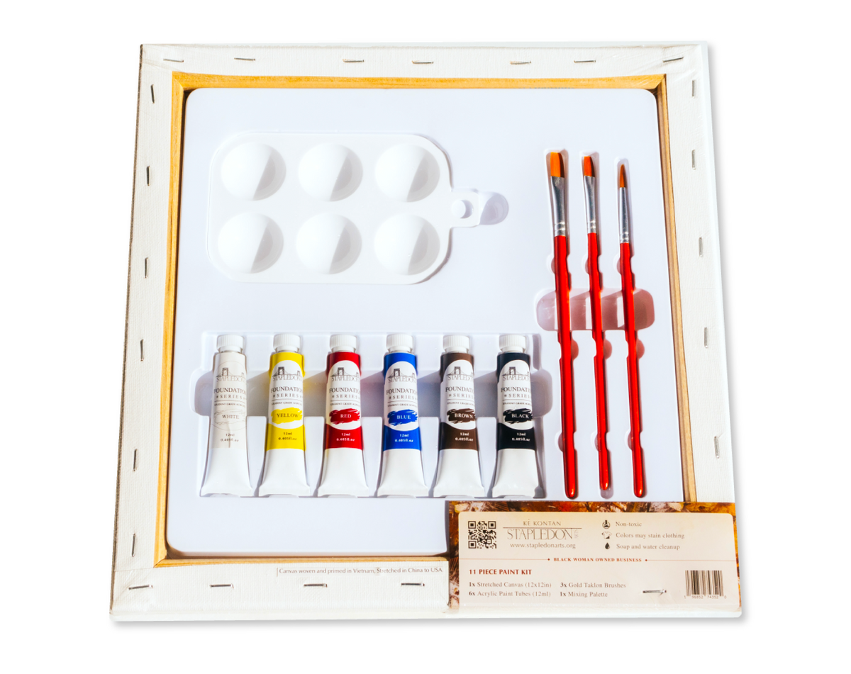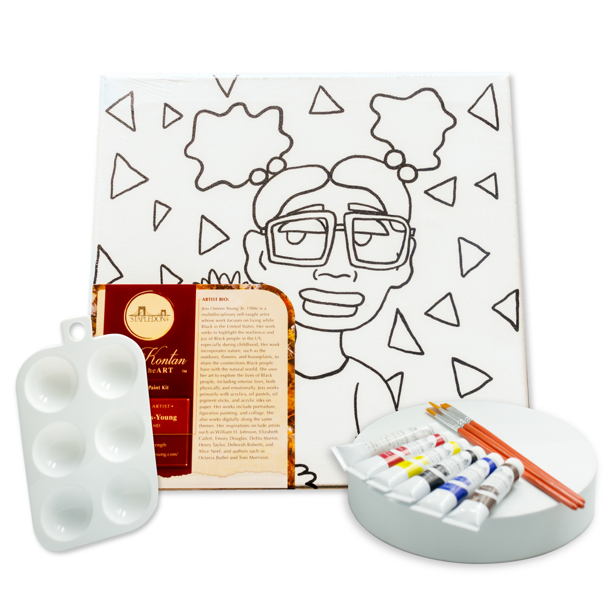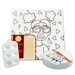 Unit price perKè Kontan is an 11 Piece Paint Kit. Kè Kontan is Haitian Creole for "Happy heART" and was created to bring joy through creativity. This paint kit displays a girl with glasses and two afro puffs, holding a sunflower, and triangles in the background.